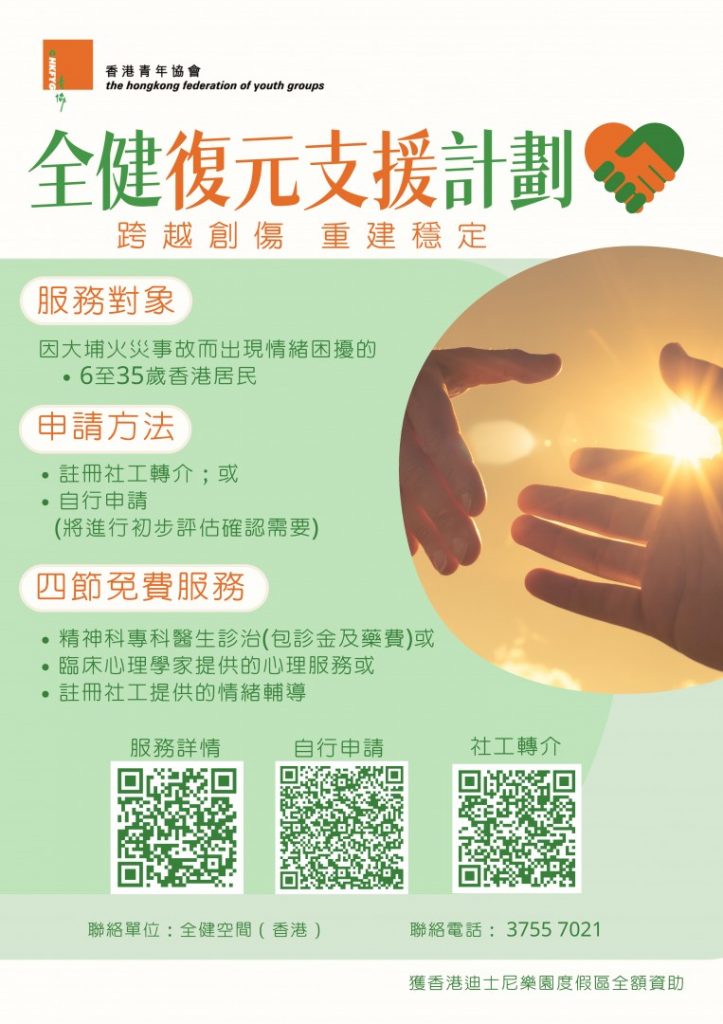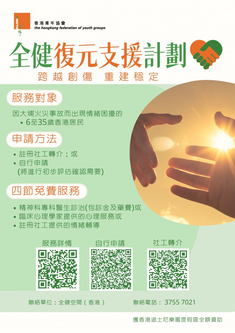 為因大埔火災事故出現情緒困擾的人士,推出全健復元情緒支援計劃,資助合資格市民使用精神科專科診治、臨床心理介入或社工情緒輔導,協助市民跨越創傷,重建心理韌力與內心安穩。