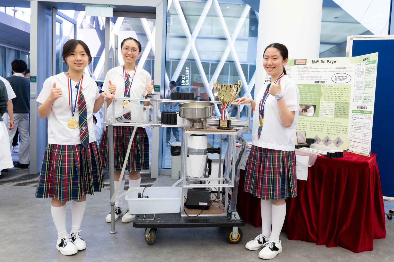 初中組(發明品)冠軍來自聖保祿學校,作品名稱為「餘紙」。該方案透過流動式廚餘製紙機,即時將植物性廚餘與廢紙轉化為再生紙張,減少都市固體廢物、減輕堆填區壓力,避免長途運輸廚餘及降低碳排放,同時減輕政府在處理廚餘上的財政負擔。