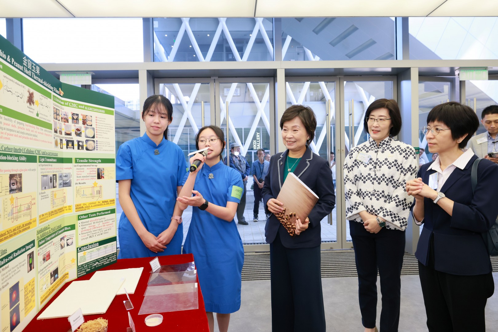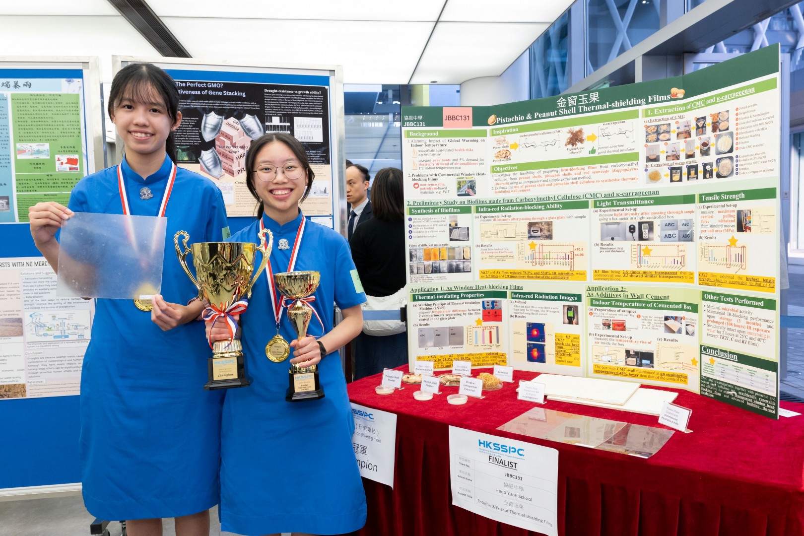 初中組(研究項目)冠軍來自協恩中學,作品名稱為「金窗玉果」。本研究提取開心果及花生殼中纖維素,以及紅海藻中的卡拉膠,製成玻璃隔熱薄膜;亦將堅果殼纖維素混入水泥,製成隔熱塗層,以舒緩因全球暖化而導致室內氣溫上升的影響。
