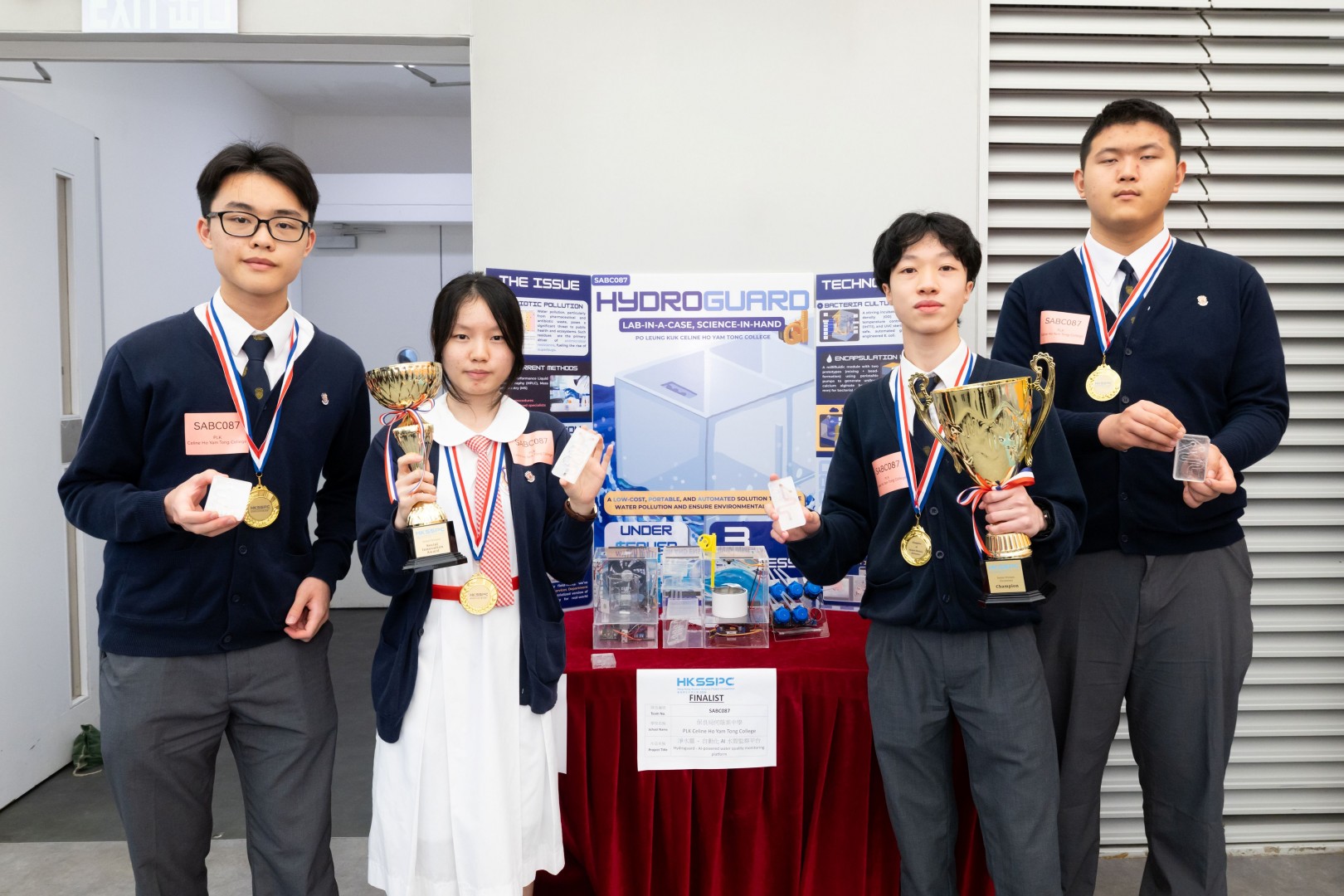 高中組(發明品)冠軍來自保良局何蔭棠中學,作品為「淨水靈 —— 自動化AI水質監察平台」。「淨水靈」是一款結合物聯網及AI 視覺系統的微型實驗平台。透過追蹤海藻酸鈣珠內基改大腸桿菌的色素蛋白訊號,串聯合成生物學與真實世界的環境數據收集。